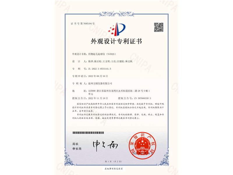 中國外觀設(shè)計專利:織物起毛起球儀(ZL 2022 3 0533141.5)