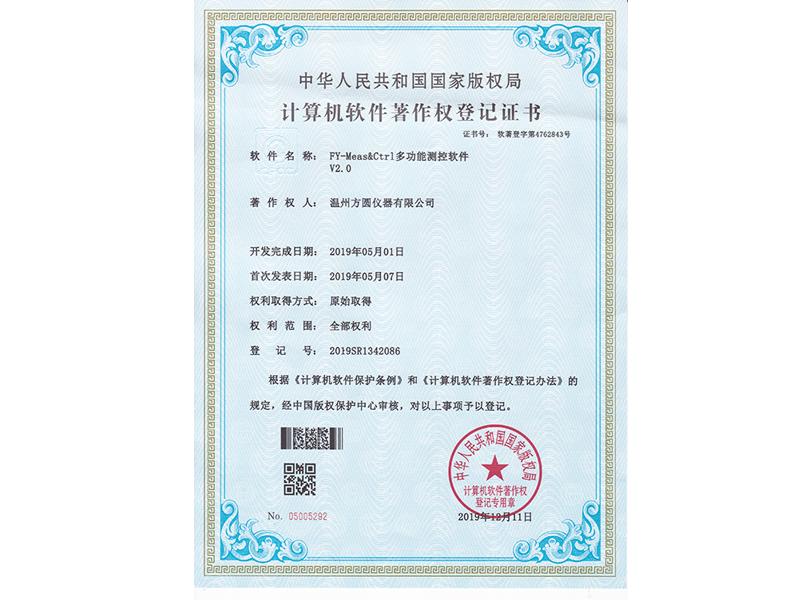 中華人民共和國國家版權(quán)局 計算機(jī)軟件著作權(quán)登記證書:FY-Meas&Ctrl多功能測控軟件V2.0(軟著登字第4762843號)
